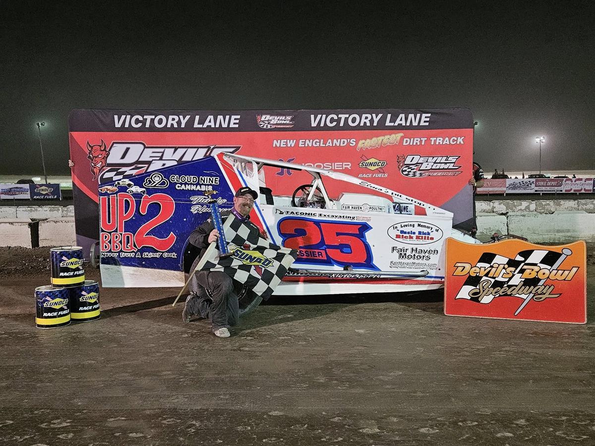 West Haven, VT- If the number of people in the victory lane photos is any indication, Billy Lussier and Bob Kilburn scored two of the most popular wins of the season on Friend Construction “Night of Features” at Devil’s Bowl Speedway Saturday evening. Double features mean the opportunity to earn double points, with the track championship races heating up. Championship Night is only a month away, and the top contenders are scrapping and clawing for every point they can muster.